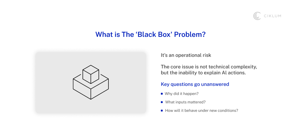 When leaders talk about black-box systems, the concern is not technical complexity. It is an operational risk. A system becomes a black box when it acts, but no one can clearly explain why it did what it did, or how it will behave under new conditions. Without that clarity, accountability becomes ambiguous, leaving legal, risk, and compliance teams unsure where responsibility sits when autonomous decisions have real-world consequences.