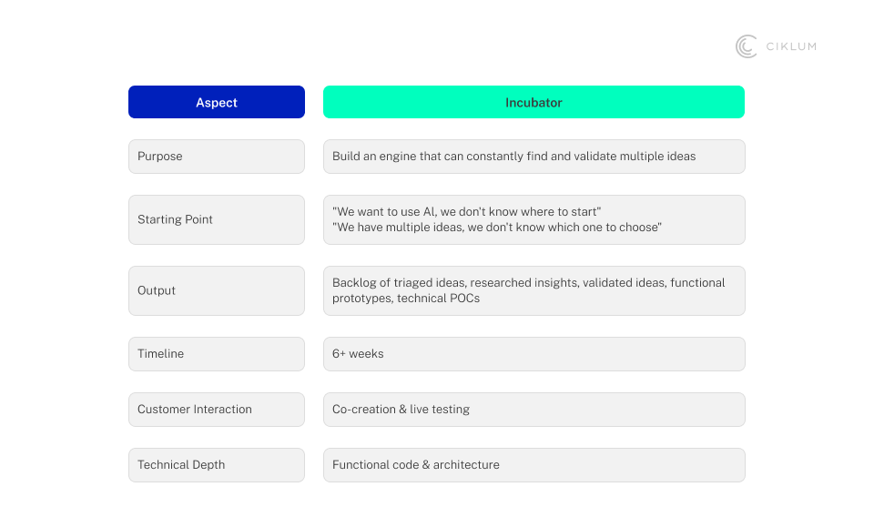 Unlike traditional R&D projects that can run for months without clear results, the Incubator focuses on proving what works before anything is fully built. This helps ensure that every idea supports business goals, meets regulatory expectations, and proves customer value.