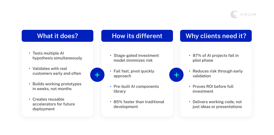 | More AI PoCs and experiments | A disciplined, repeatable validation framework |