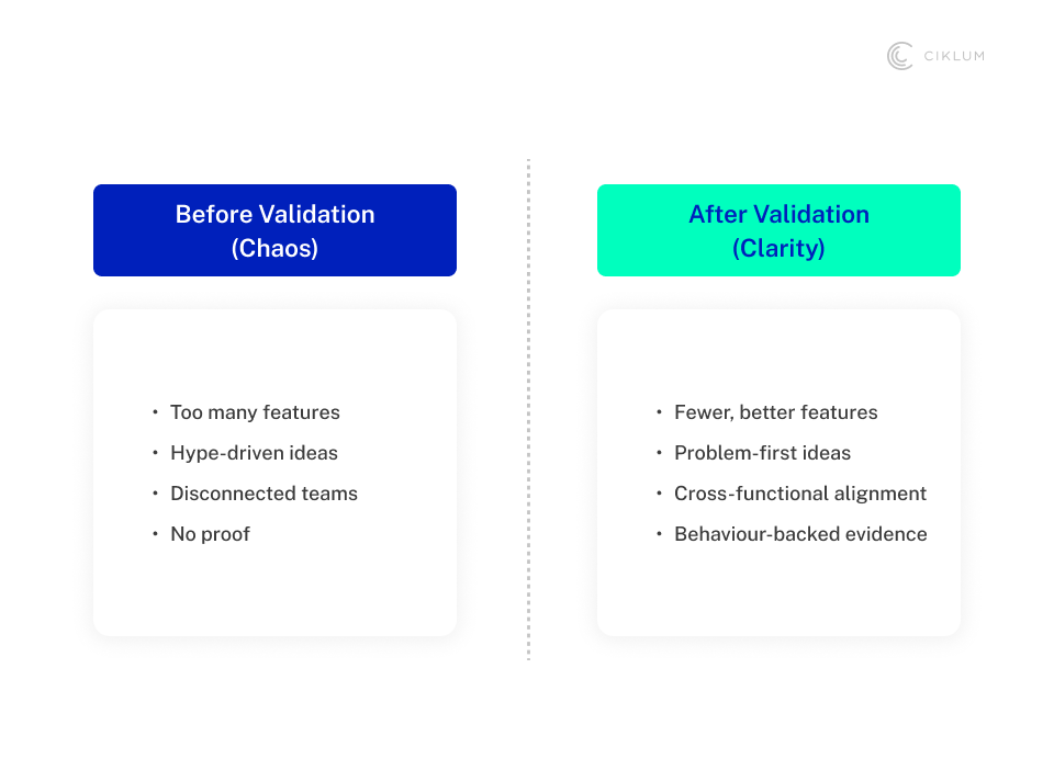 Workshops and interviews aren’t validation. Real validation requires behavioural evidence, customer signals, and measurable proof of value.