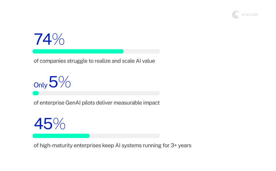 Meanwhile, the most mature organizations demonstrate that sustained value is achievable. 45% of high-maturity enterprises keep AI systems running for 3+ years, giving them the usage, learning cycles and proprietary data required to become smarter, more efficient and more accurate over time.
