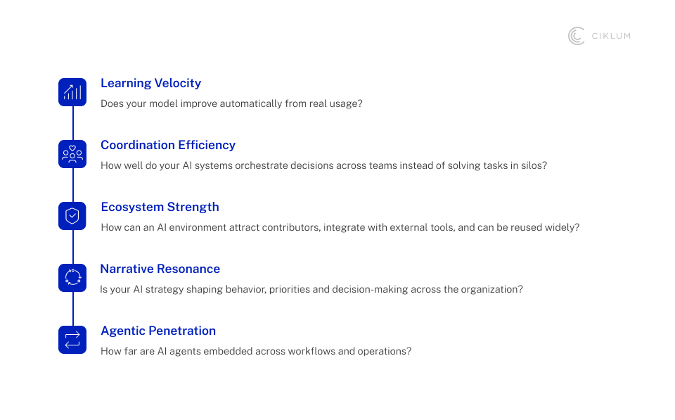 To help organizations diagnose this, Ciklum developed the Five Leading Indicators Framework - a maturity model that reveals whether your AI ecosystem is on a compounding trajectory.