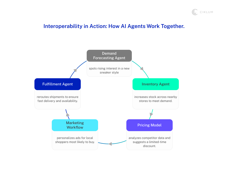 In this setup, plug-and-play AI tools handle different jobs while sharing information in real time. An AI system spots rising demand for a new sneaker and alerts the inventory tool to restock nearby stores. The pricing system adjusts discounts, the marketing tool targets likely buyers, and the delivery system reroutes shipments to meet demand.